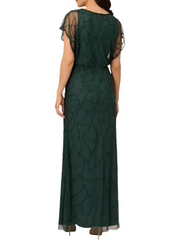 Adrianna Papell V-neck Dolman Sleeve Blouson Zipper Closure Beaded Mesh Gown